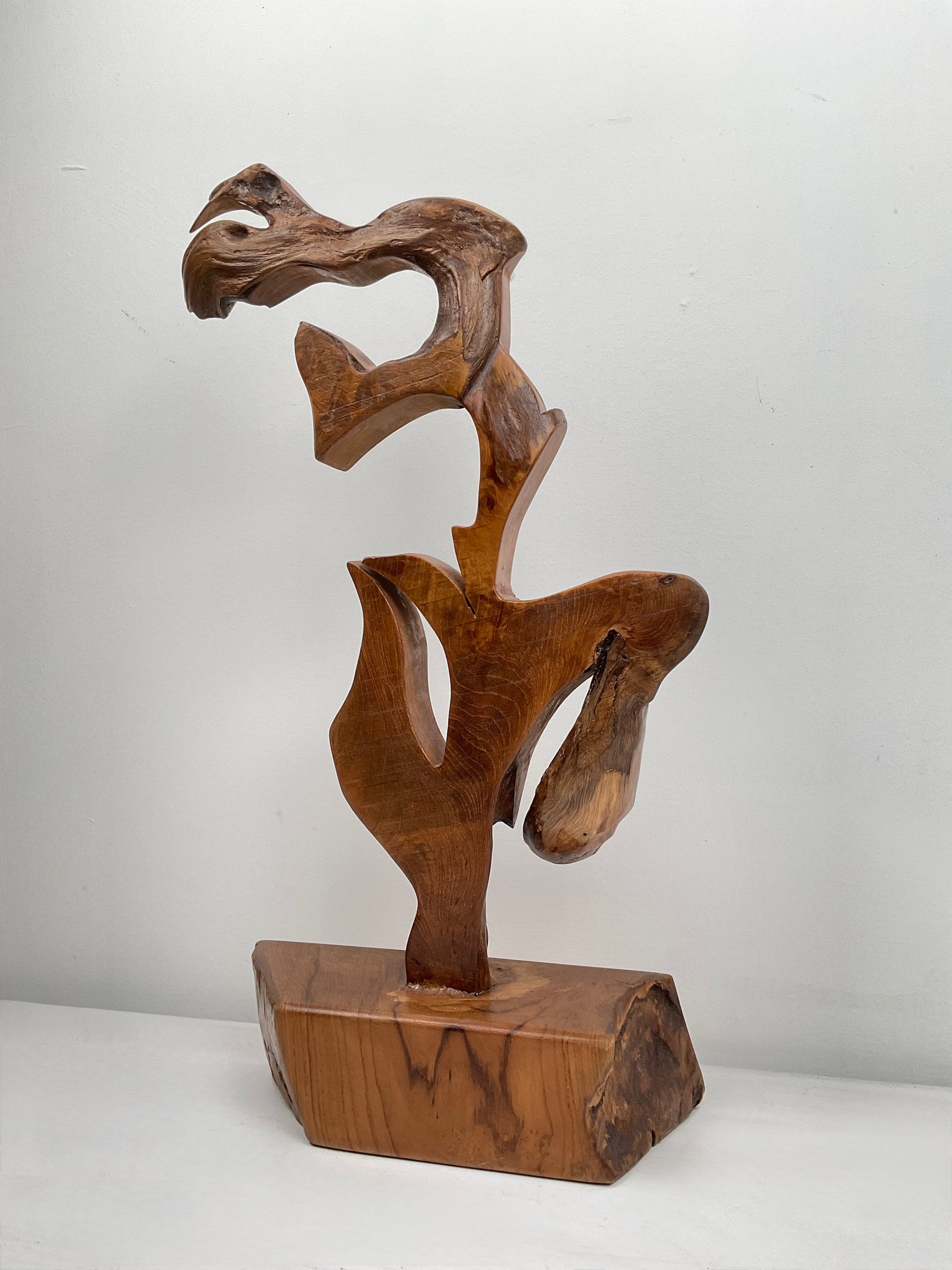 Rising with elegance and movement, this sculpture feels alive—its flowing lines echoing the flicker of a flame or the swirl of wind. The natural curves and hollows are shaped from solid Indonesian teak, allowing the grain to guide the form.