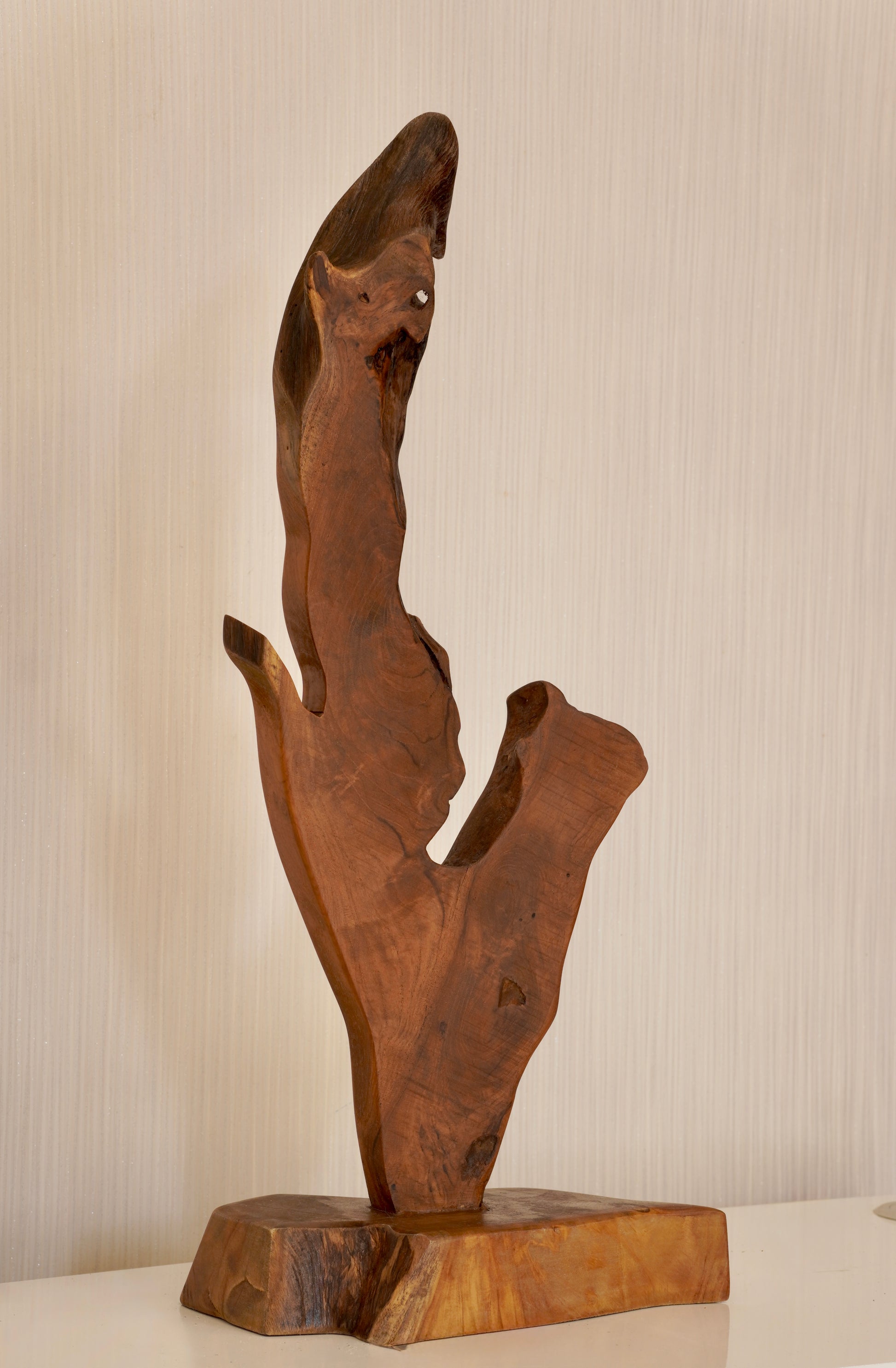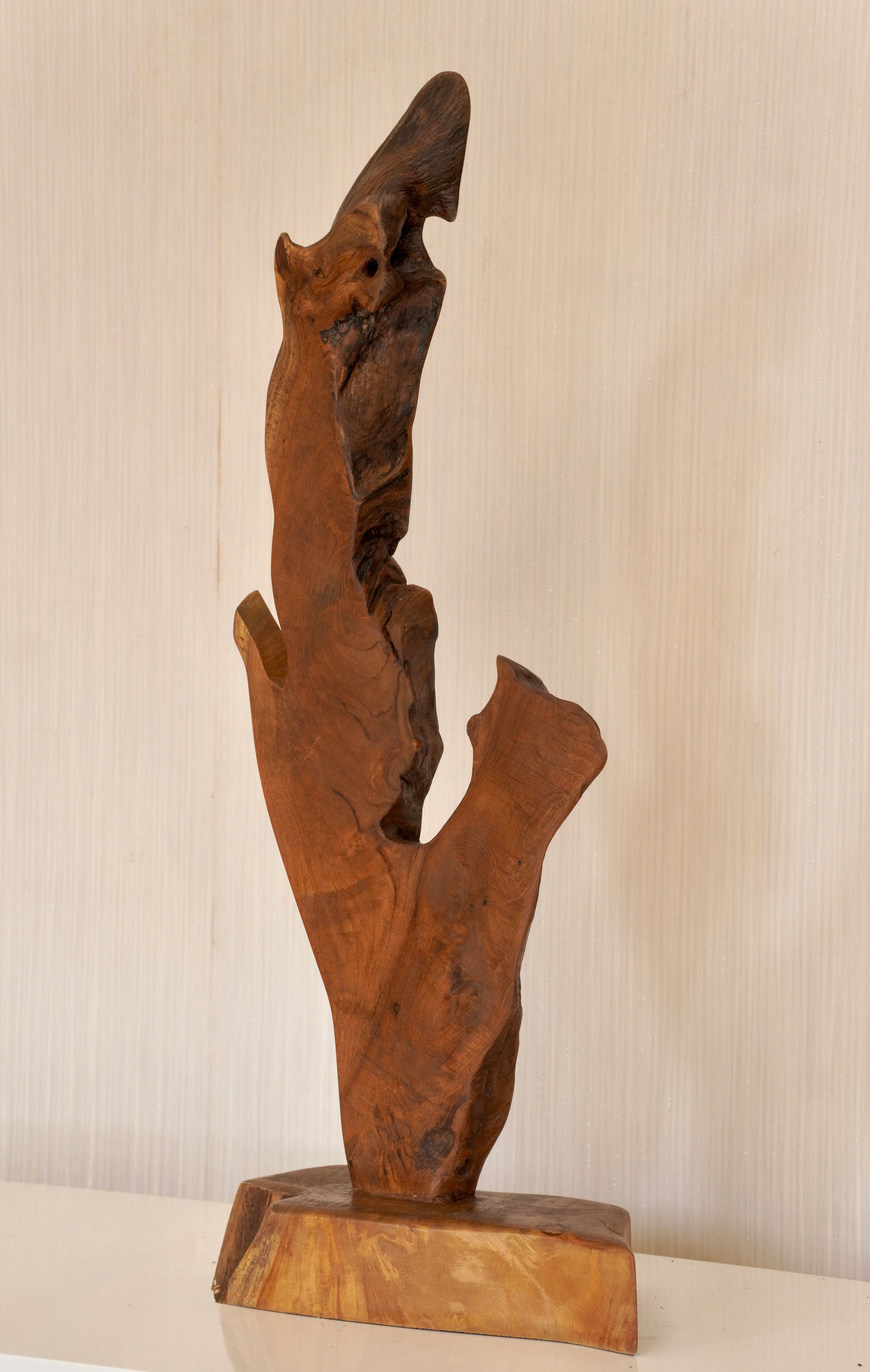 Resting on a solid teak base, the vertical composition gives it a commanding presence, perfect for spaces that call for both elegance and boldness. The natural NC finish preserves its warm tone while highlighting every unique contour.