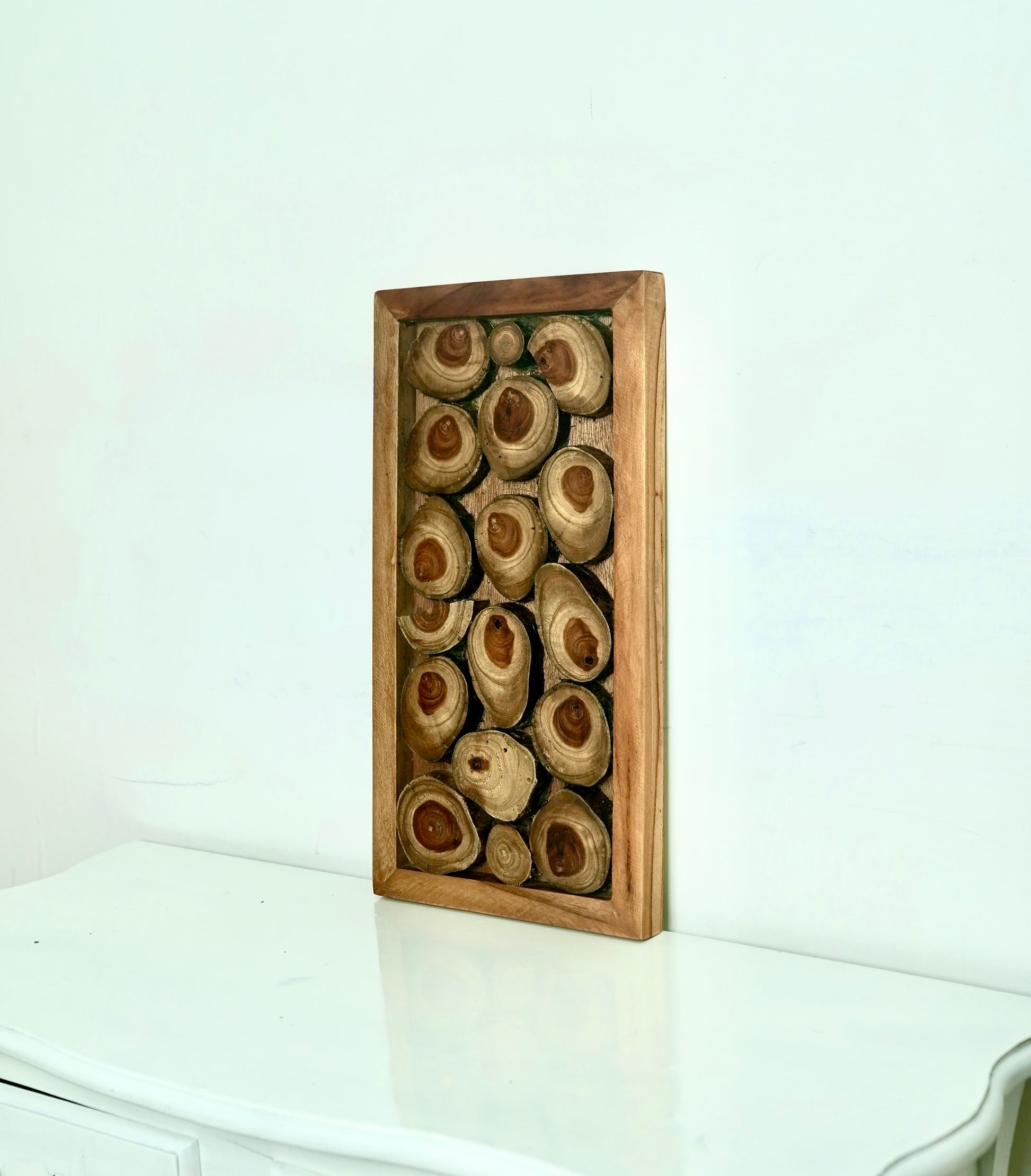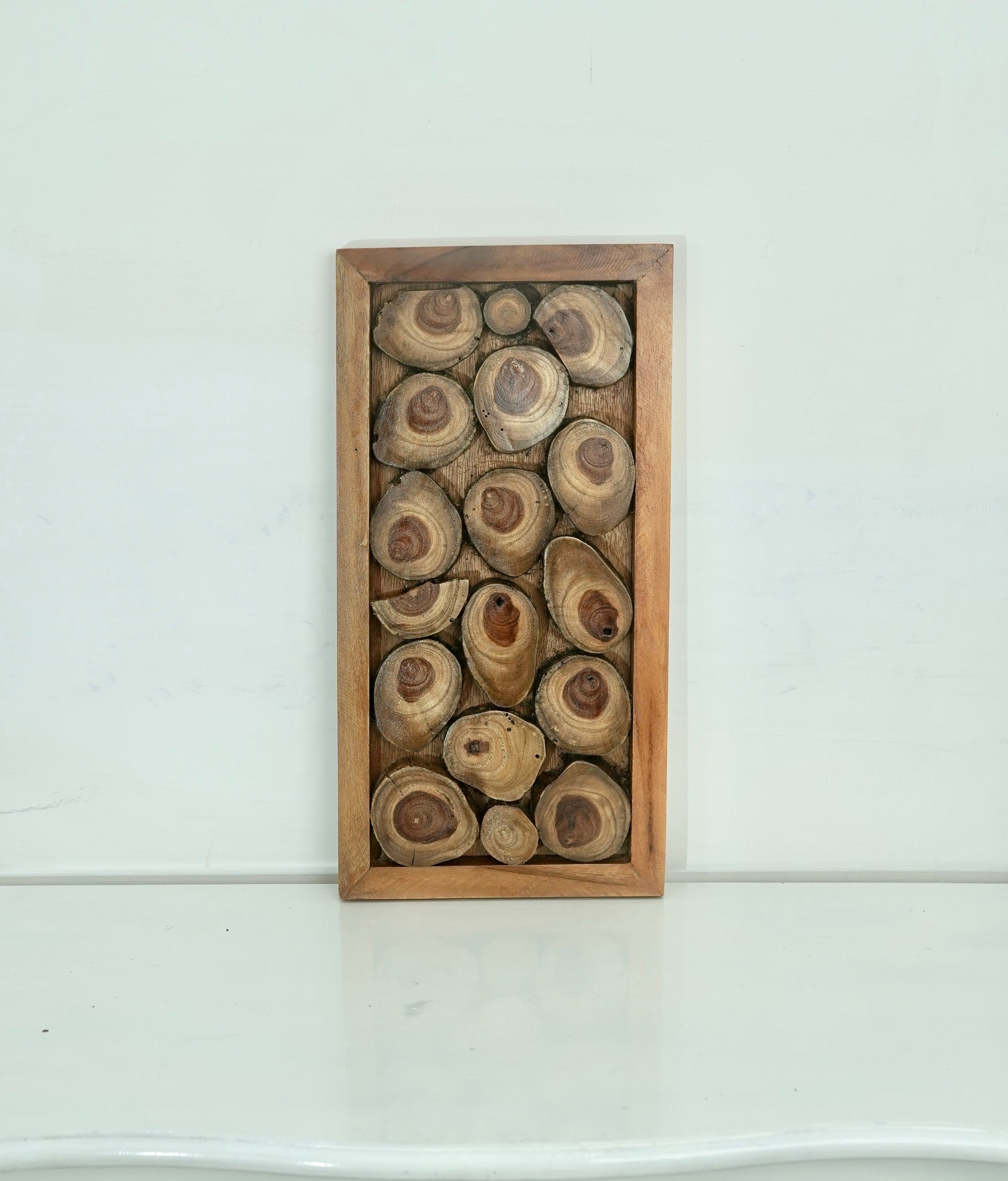 A quiet celebration of nature’s geometry. This handcrafted wall piece is composed of teak branch cross-sections, each revealing its own growth rings, grain, and time-carved patterns. Framed in warm solid wood, the composition reads like a visual poem — soft, rhythmic, and grounded.