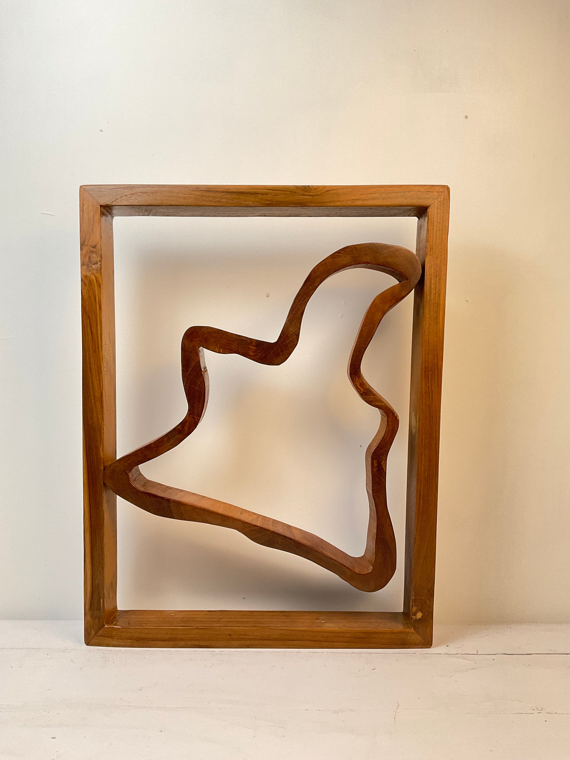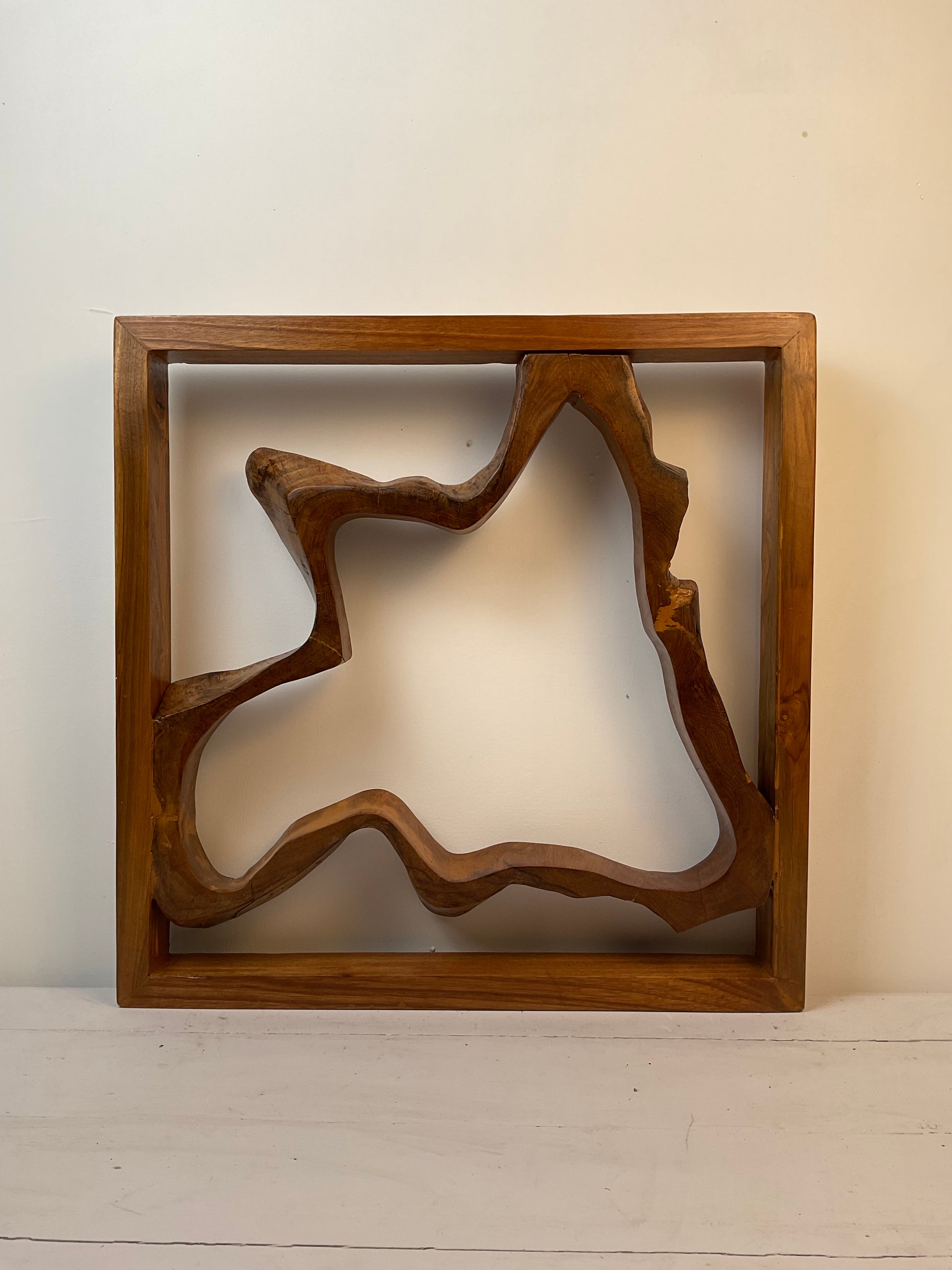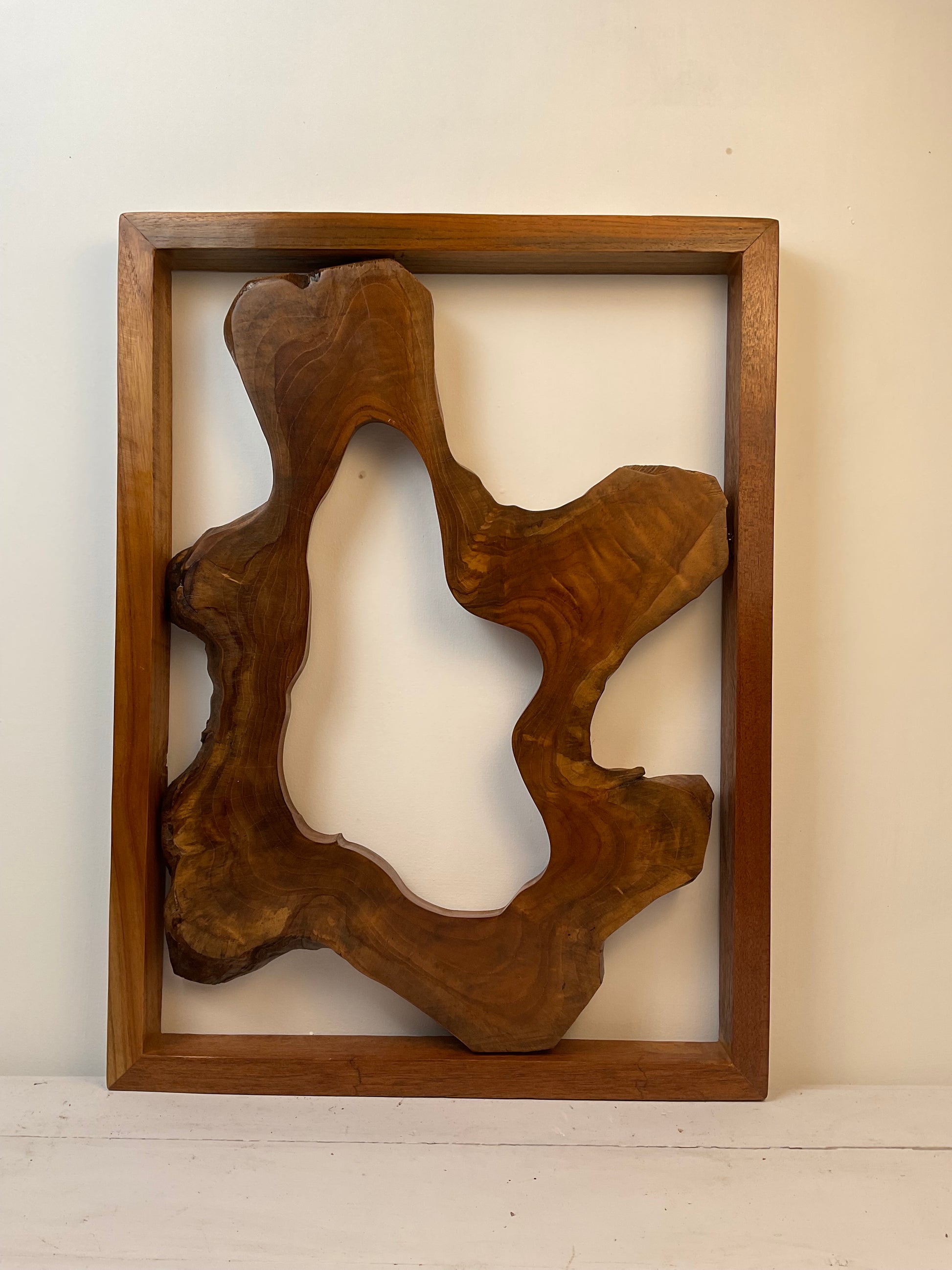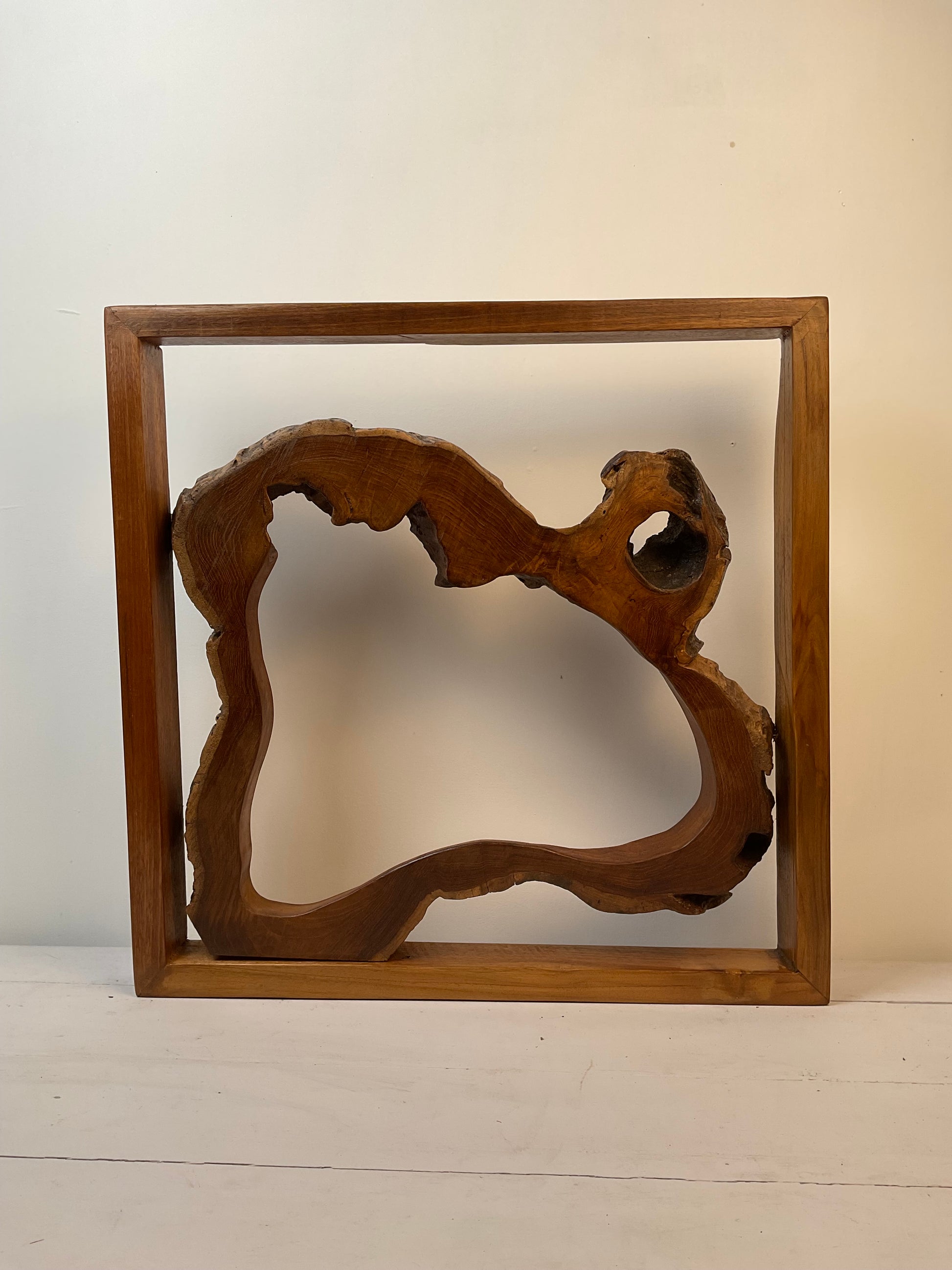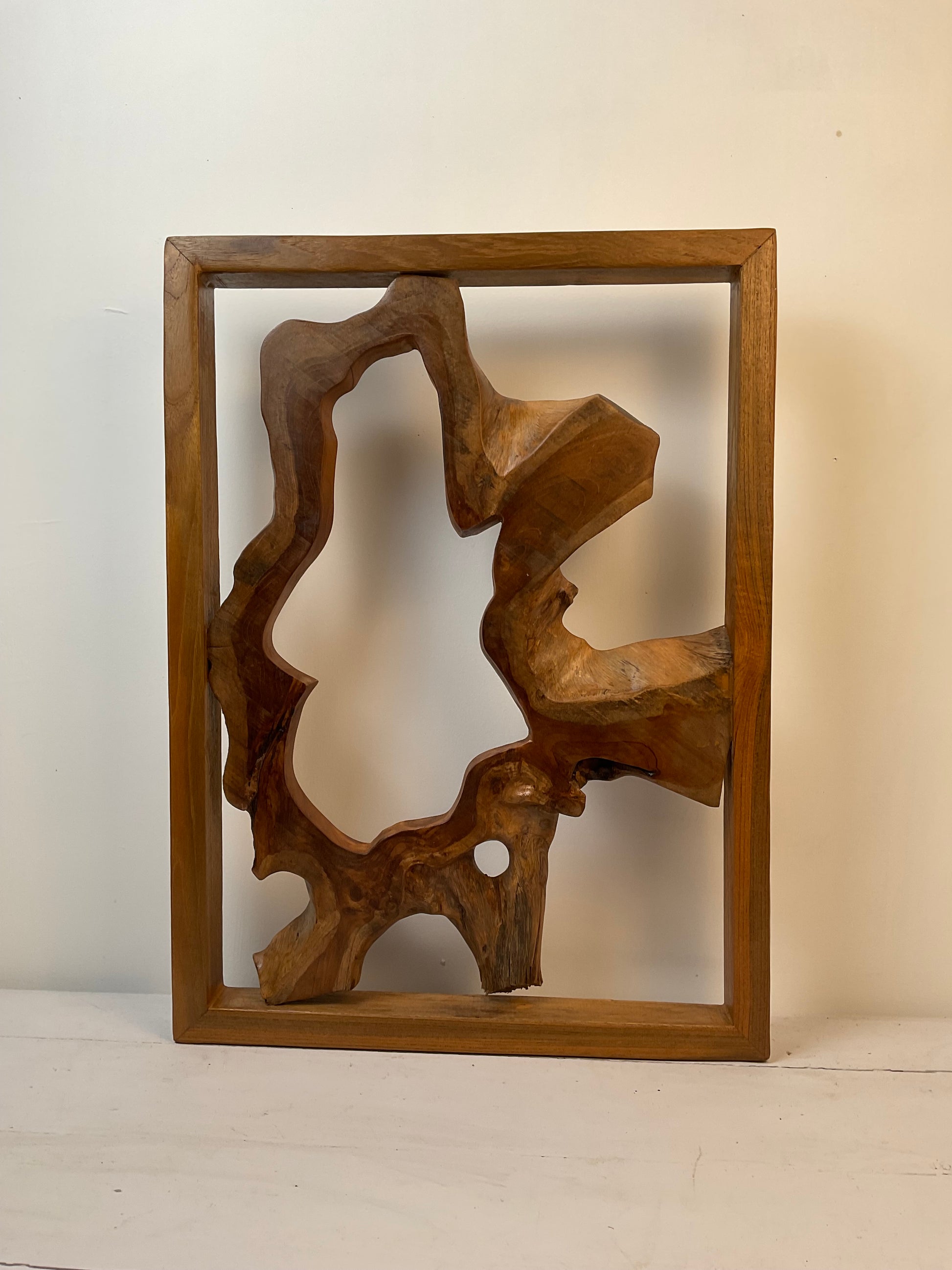 Crafted from reclaimed teak root and set in a solid wood frame.