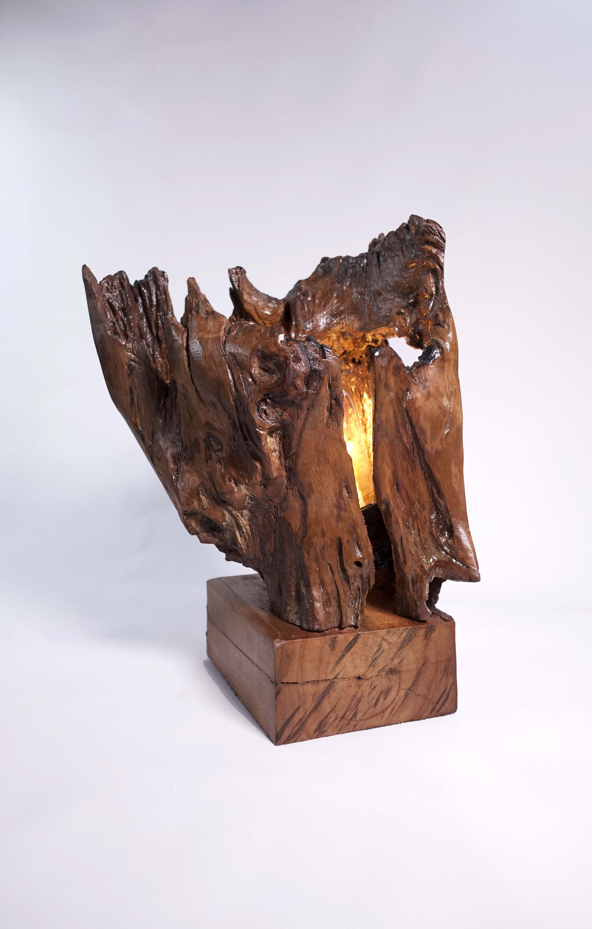 Formed by nature, lit from within. A one-of-a-kind teak lamp with an open heart.