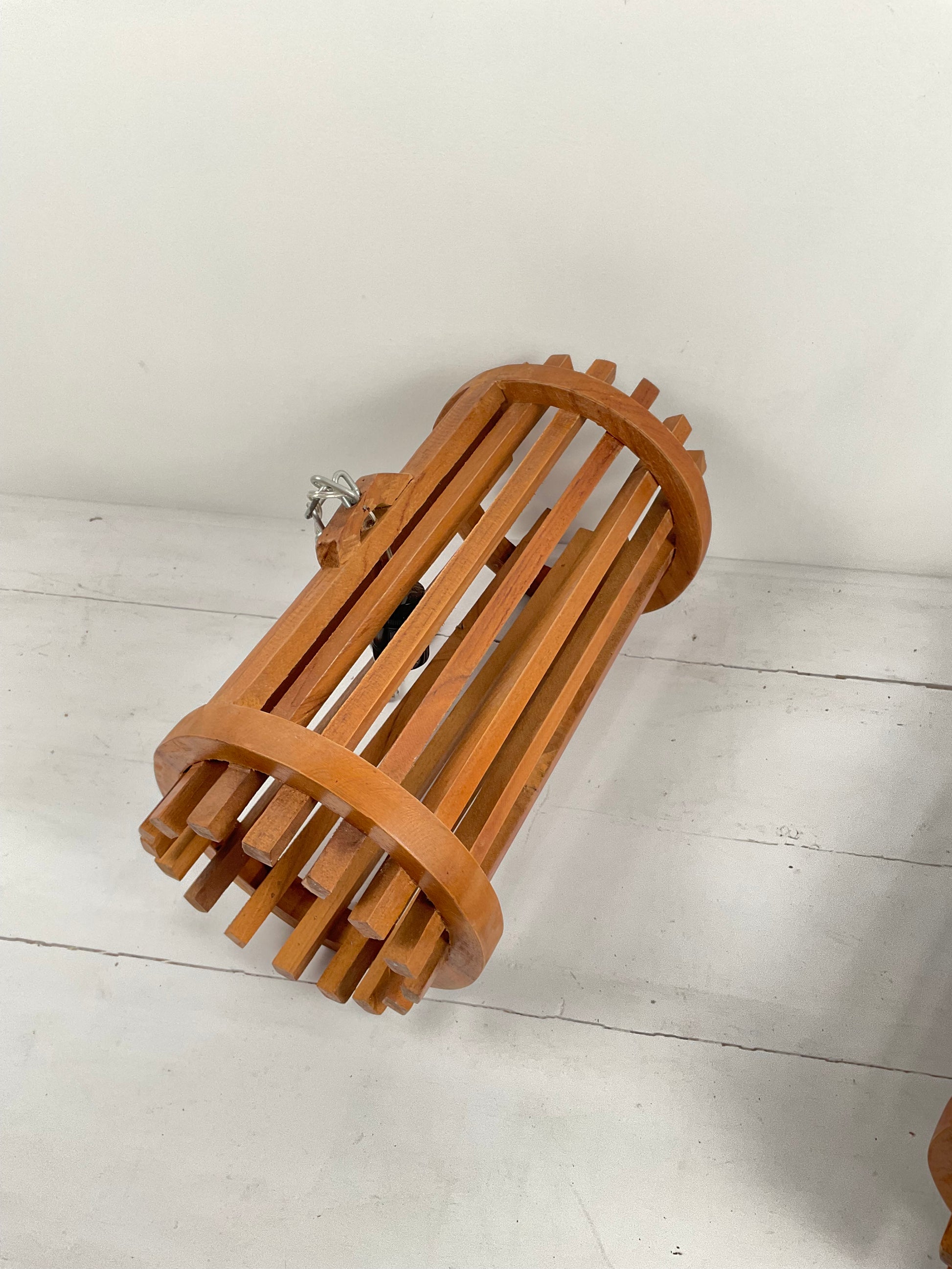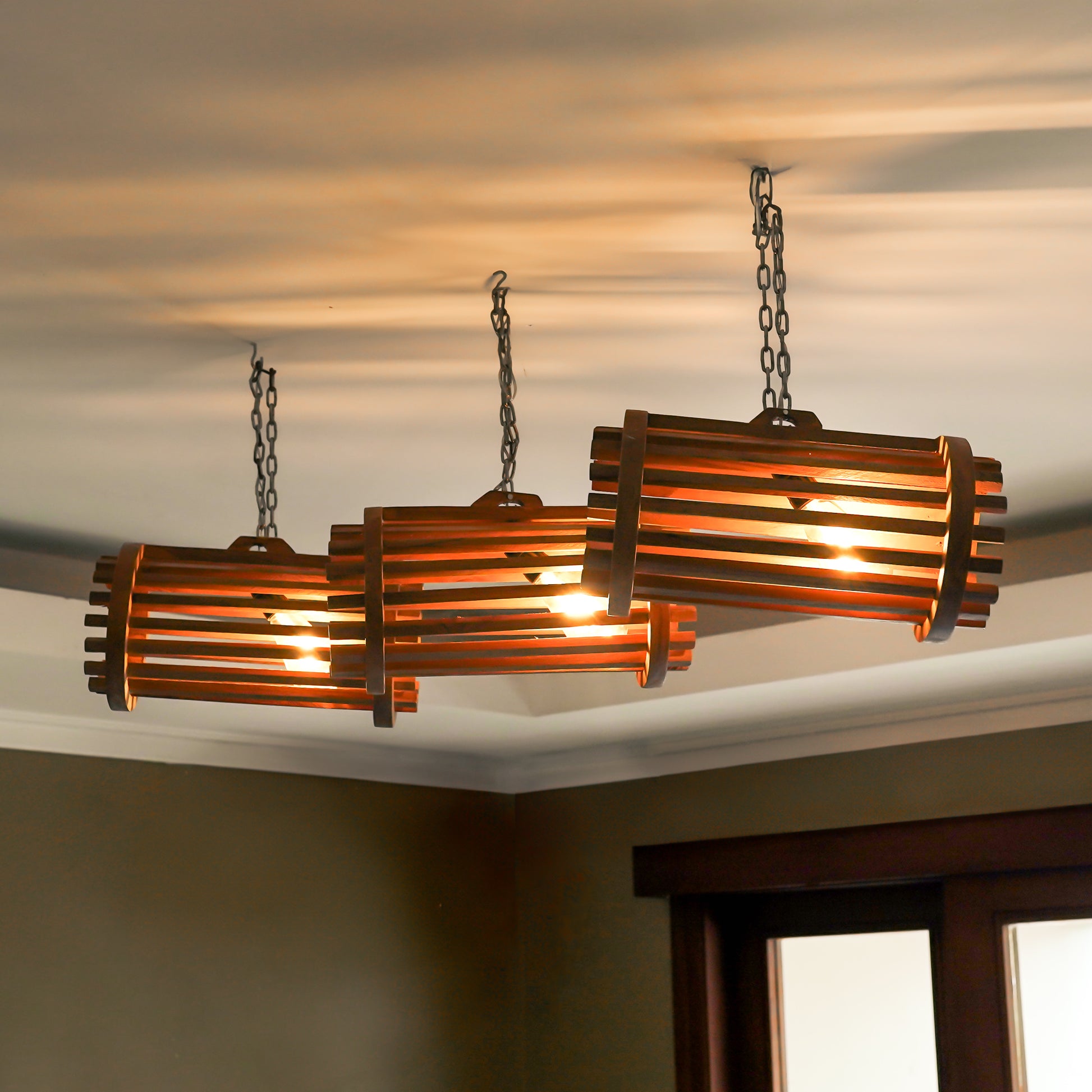 This hanging lamp trio is crafted from teak barrel-shaped slats, suspended by chain and built to impress. Their elongated horizontal shape is ideal over large dining tables, kitchen bars, or open-concept living rooms. The natural gaps between the slats allow warm light to softly escape, creating a striking play of light and shadow.