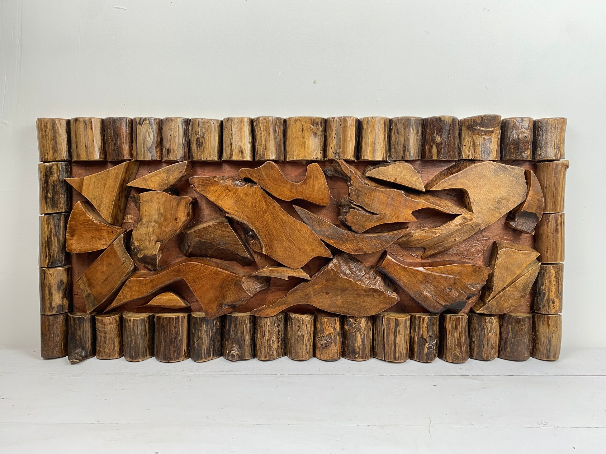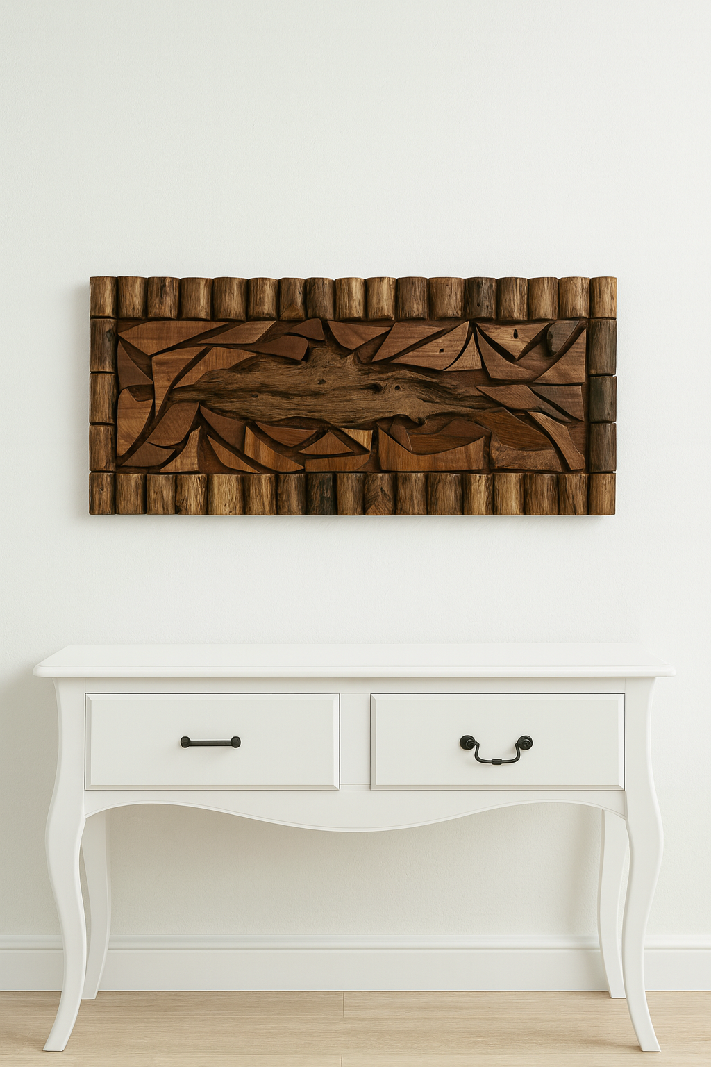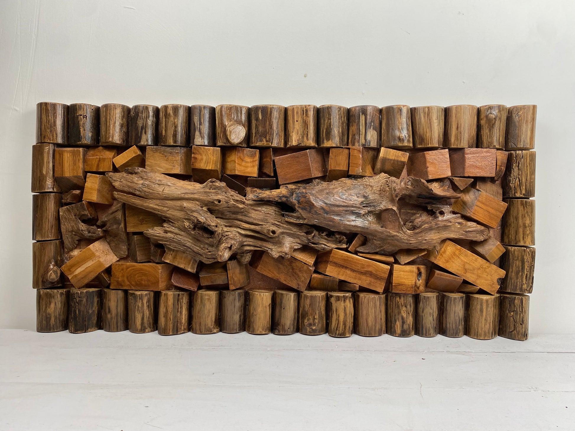 A harmony of structure and wild form, this modular teak wall panel brings together geometry and nature. At its core lies a naturally sculpted teak root—its raw texture surrounded by a carved mosaic of angular wood pieces, all framed by solid teak segments.