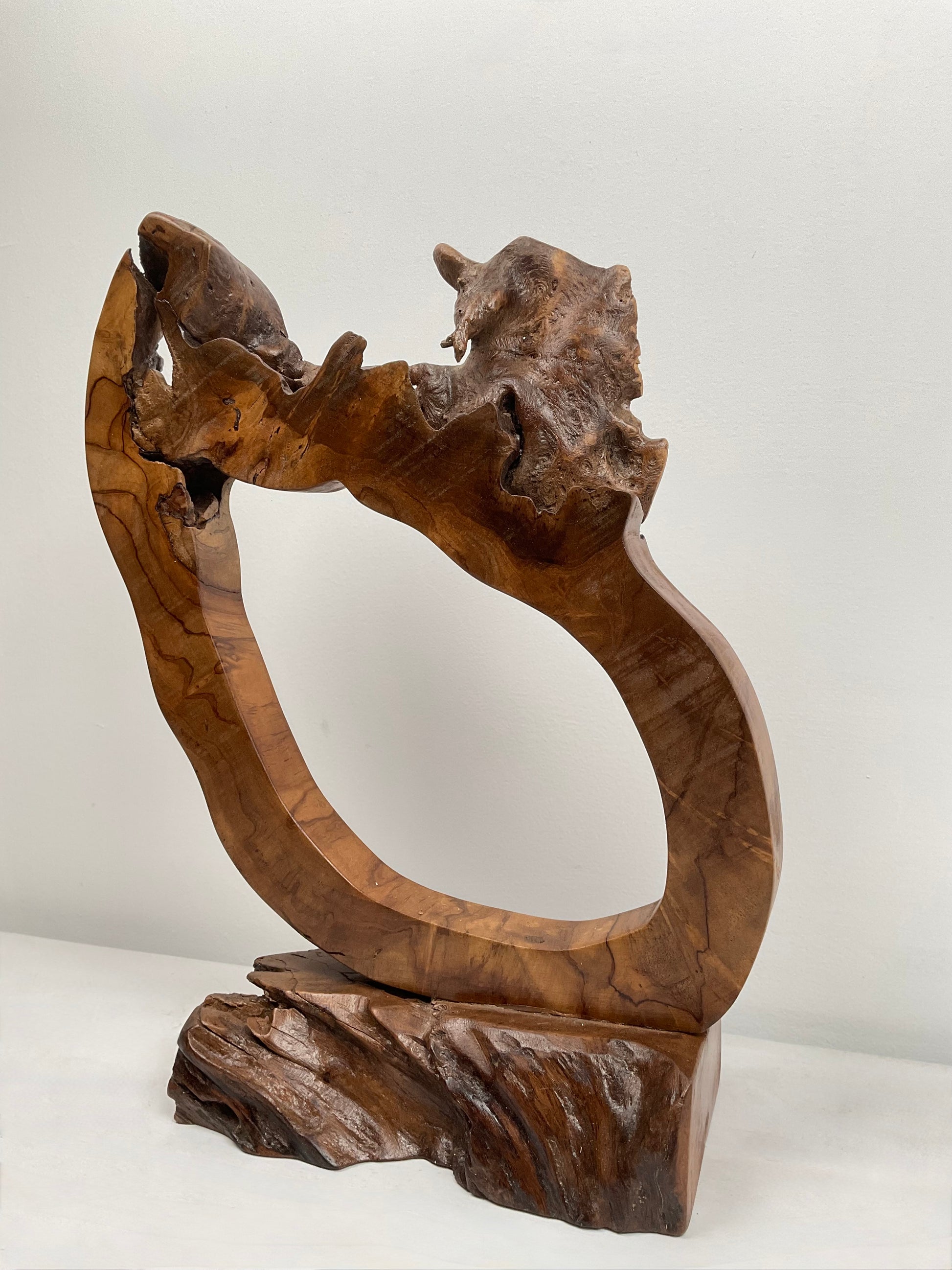 Carved from the soul of Indonesian teak, this sculpture flows in a continuous arc—an eternal loop that captures both movement and stillness. The natural grain dances along its curves, while the rugged upper crest hints at the wild origins of the wood.