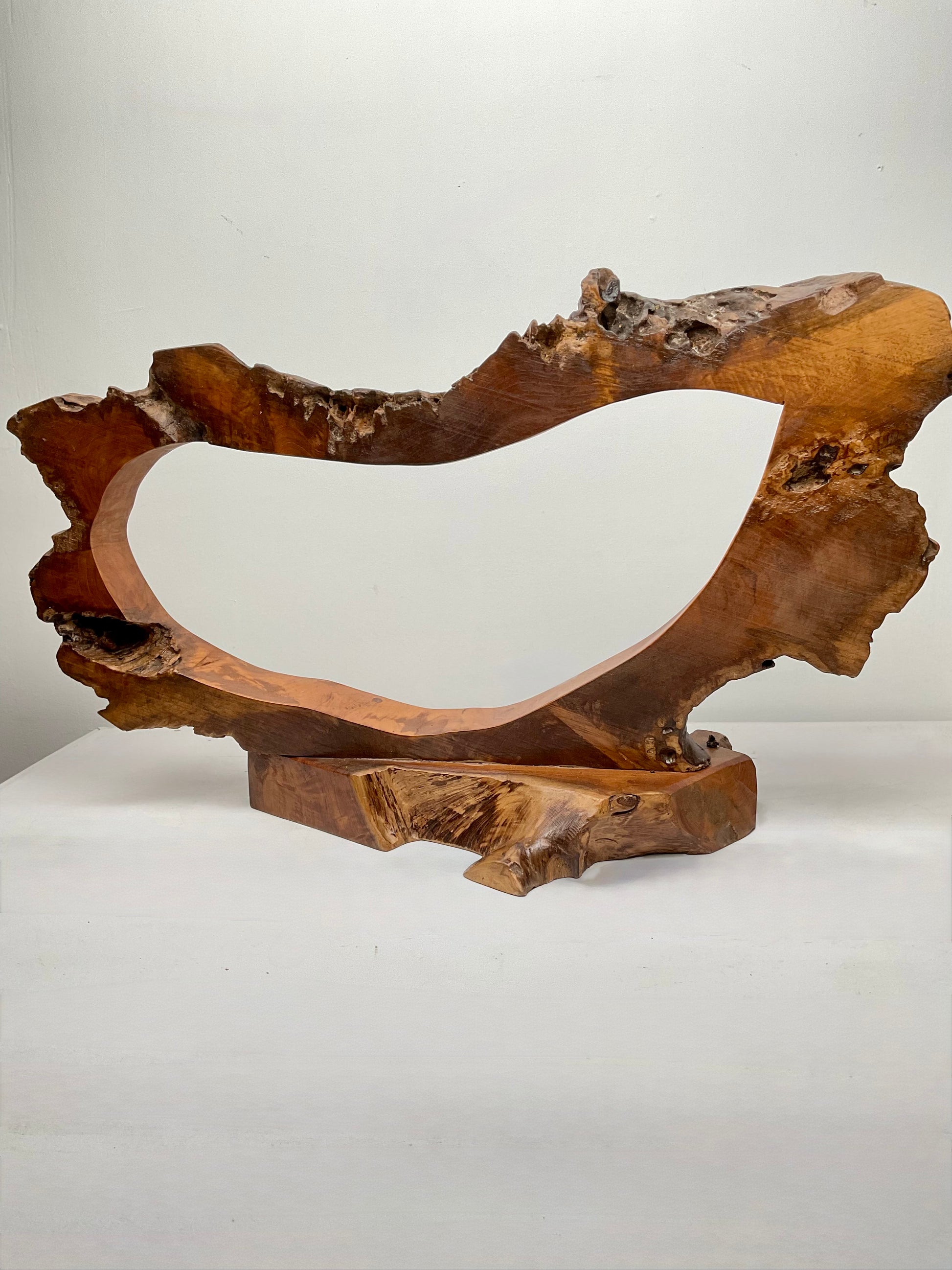 Sculpted from the raw edges of Indonesian teak, this piece forms a natural frame—its contours resembling the gentle curve of a wave or the silhouette of a distant shoreline. The open center invites the surrounding space to become part of the art, creating a changing composition with every viewing angle.