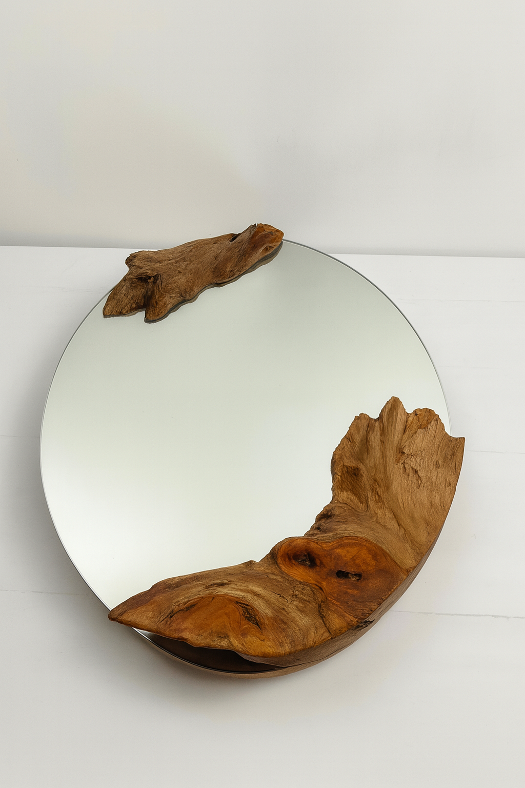 An oval mirror held between two fragments of teak root. Balanced, raw, and full of quiet beauty. One of one.