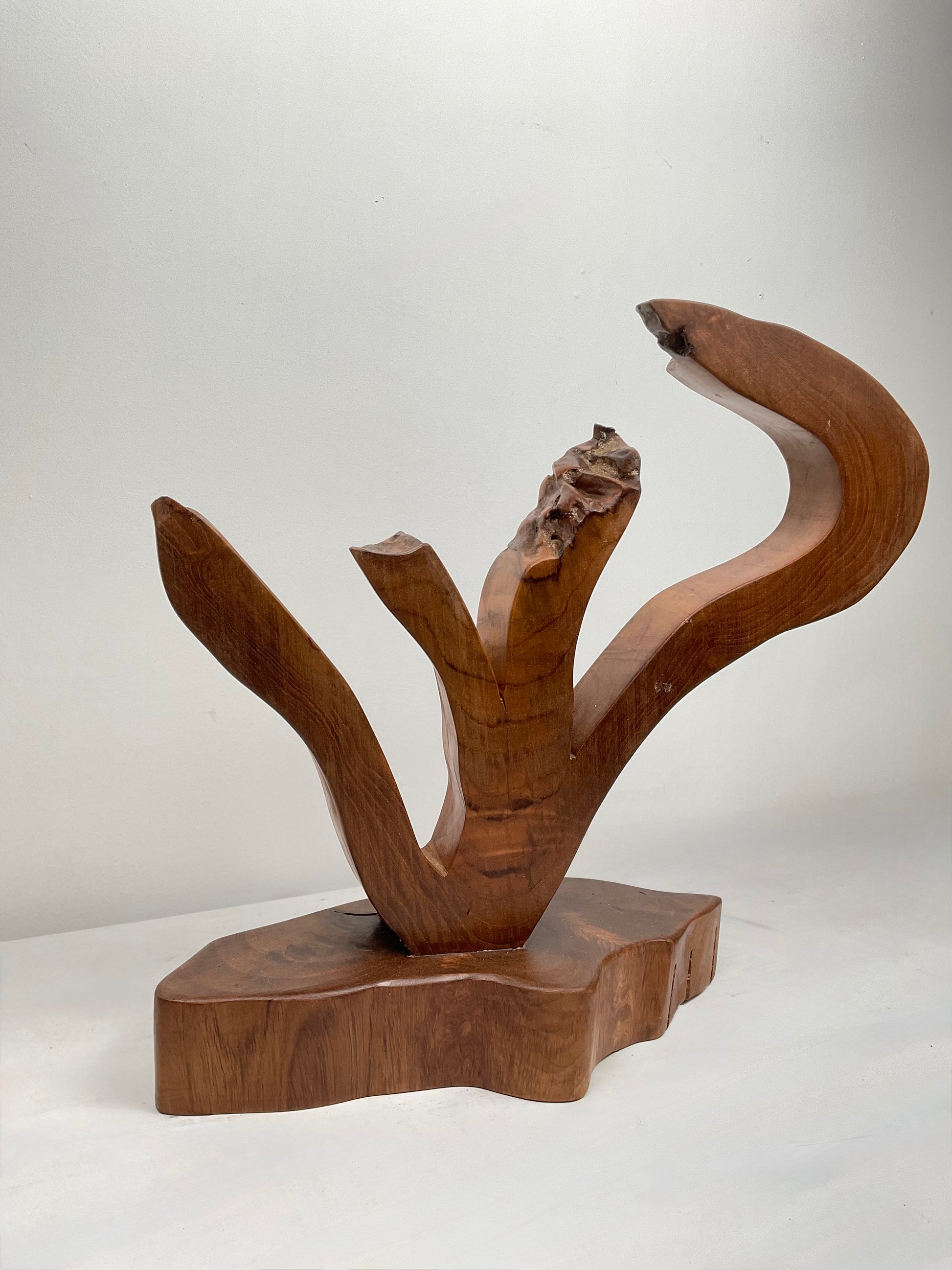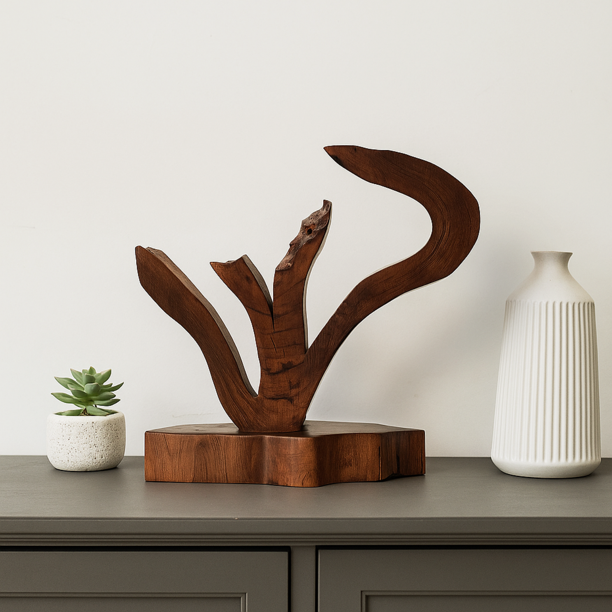 With its upward-reaching form, this sculpture captures the quiet power of growth and renewal. Each branch-like curve is guided by the natural grain of Indonesian teak, shaped by both artisan hands and the tree’s own life story.