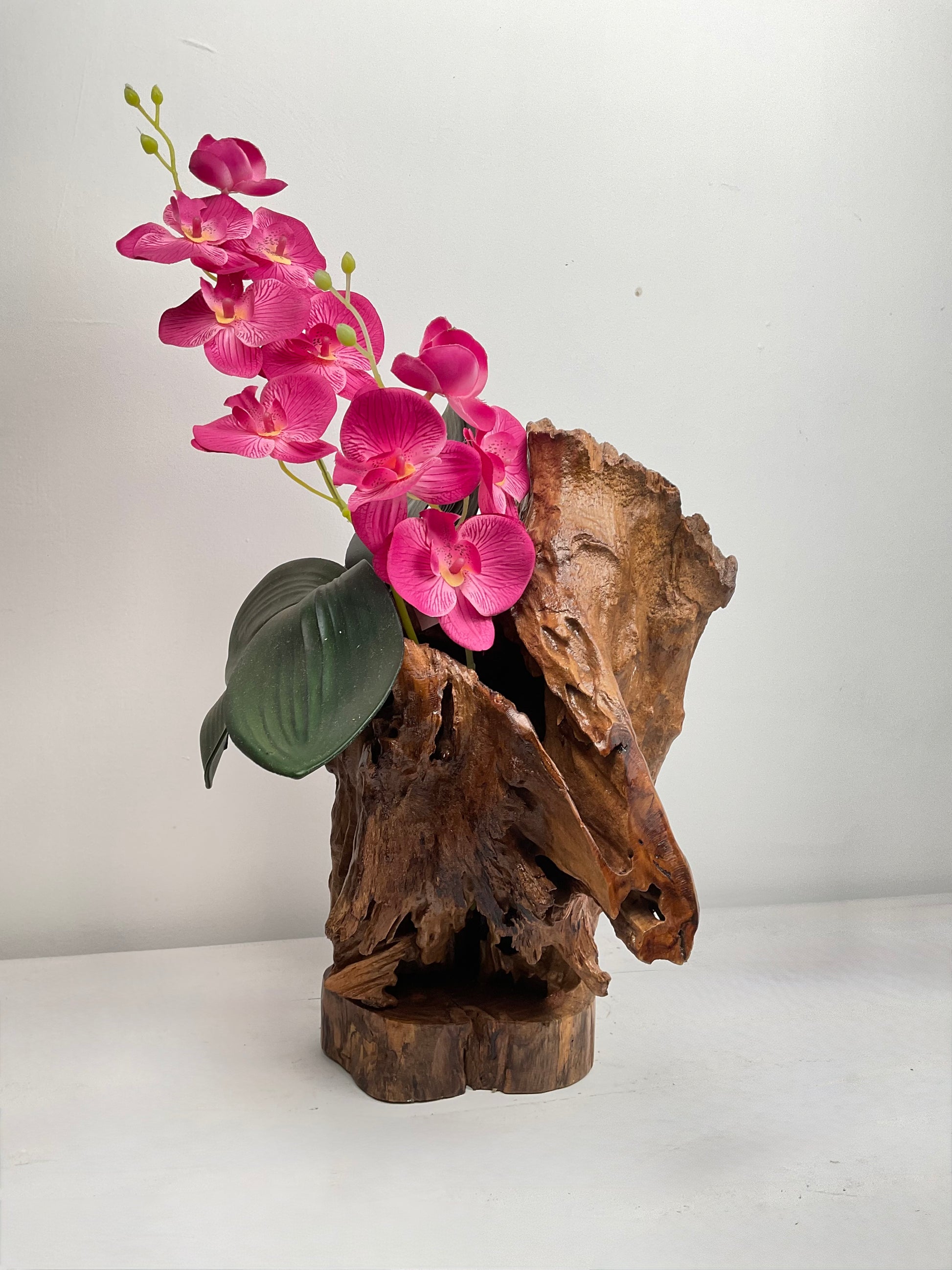 From the rugged heart of teak emerges a form both fierce and graceful—its weathered surface holding the memory of wind, rain, and time. Rising from its natural crevices, a cascade of vivid pink orchids bursts into life, their delicate petals contrasting against the deep, earthy grain of the wood.