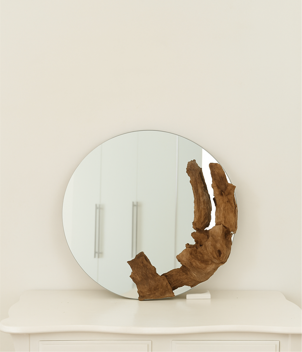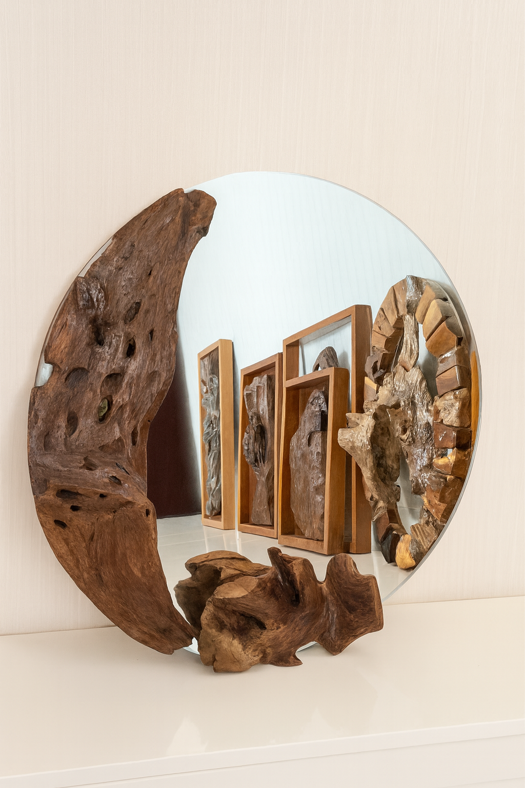 Handcrafted teak root round mirror – organic, sculptural, and one-of-a-kind. Natural wood mirror for earthy, modern interiors.
