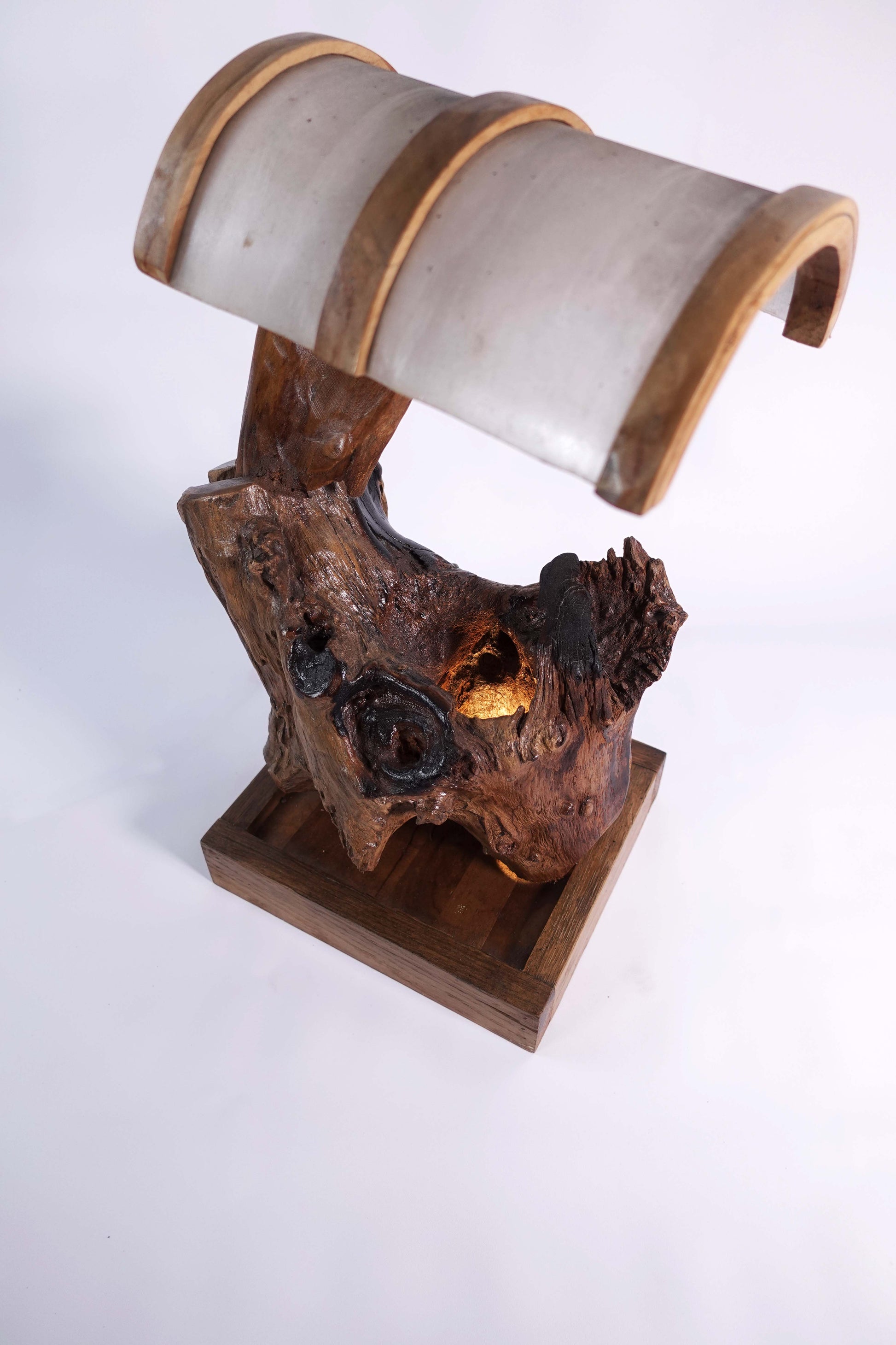 • Material: Natural teak root base with carved solid wood shade