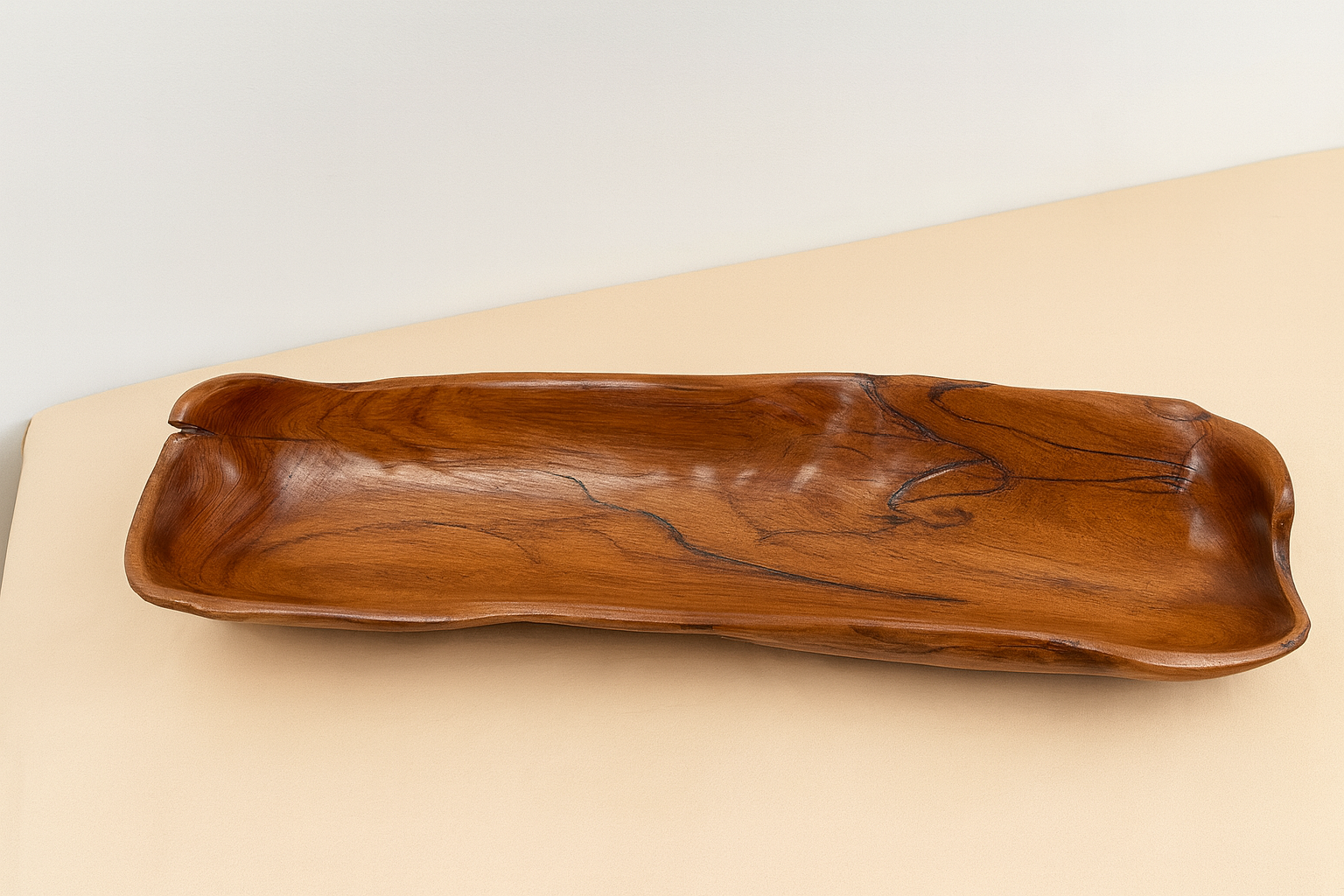 A hand-carved statement in solid teak, this elongated wood sculpture is more than a fruit bowl — it’s a functional art piece. With a shape guided by nature and grain that tells its own story, it brings quiet drama to any space.