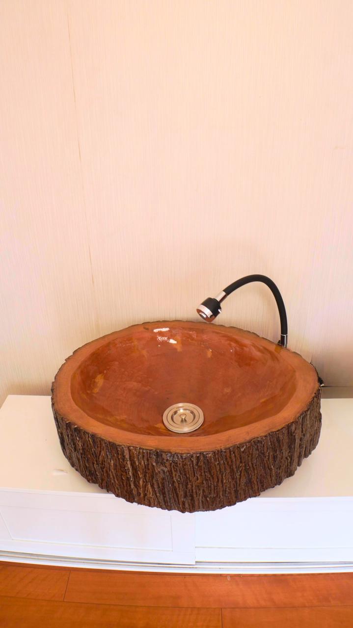 This beautiful wooden sink is made from solid wood. It is strong, water-resistant, and has a smooth, natural finish. Every sink is handmade, so each one is unique with its own wood grain and shape.