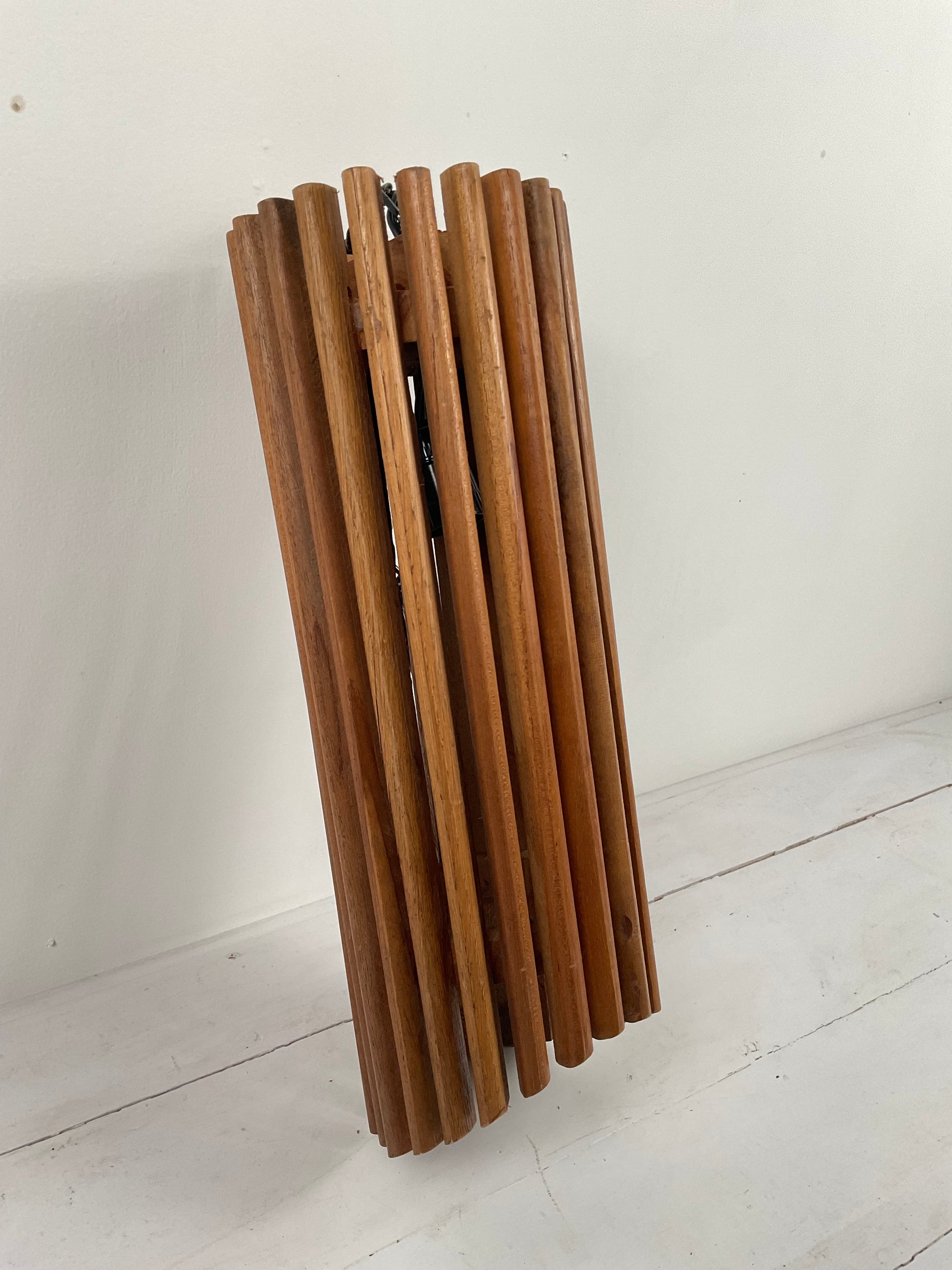 This hanging lamp is crafted from slim vertical teak slats that gently filter the light, casting warm shadows and architectural lines across the ceiling and walls. Minimalist yet striking, it’s ideal for narrow spaces, reading nooks, or contemporary interiors seeking organic texture.