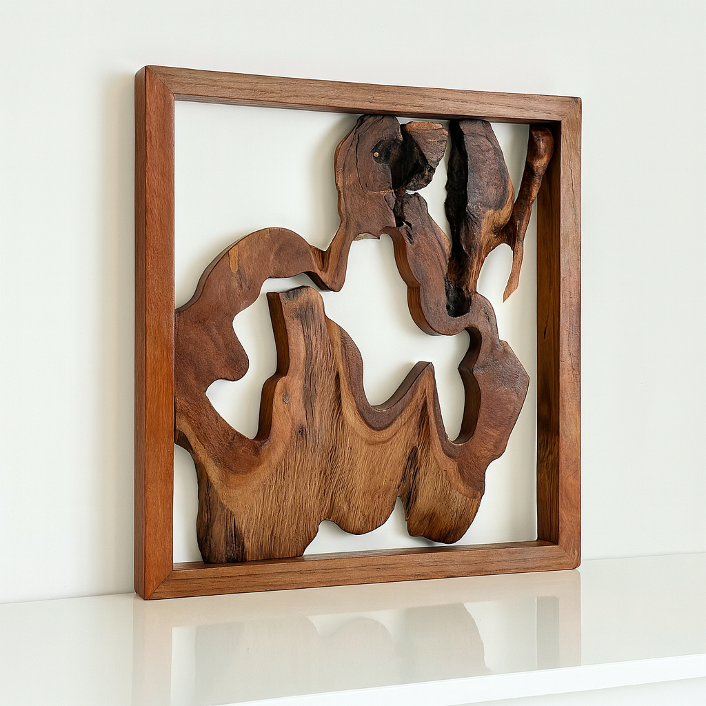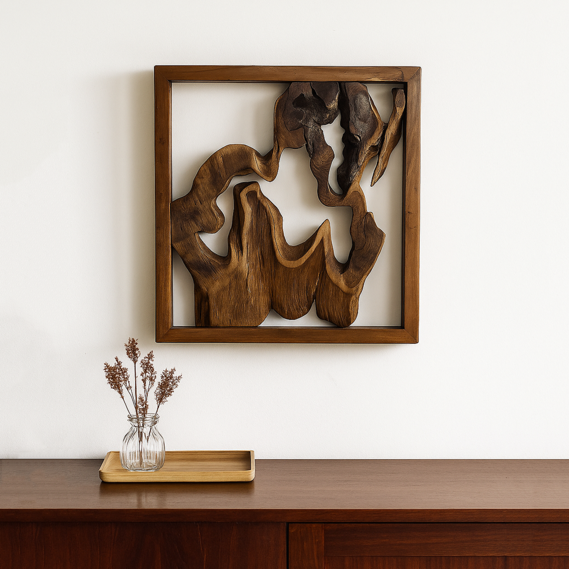 Framed like a painting, yet sculpted by nature—this abstract teak root wall sculpture captures the freeform beauty of organic lines in a modern square frame. The raw teak root inside feels like a landscape or a flowing gesture, inviting interpretation and presence.
